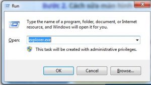 - Hộp thoại Run sẽ hiện ra, các bạn nhập vào explorer.exe rồi nhấn Enter, lúc này màn hình sẽ được reload lại (nạp lại), giao diện như bình thường, có thanh task bar và các icon trên desktop. Nếu không được, bạn hãy làm đi làm lại bước này nhiều lần.